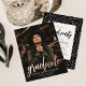 Simple graduation party invitation featuring the graduate's photo with "graduate" in real rose gold foil script. Personalize the front of the photo graduation party invite by adding the graduate's name, school name, and graduation year. The invite reverses to display your party details with a pattern of white sprinkles with a black background or color of your choice.