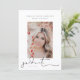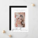 Signature script, photo snapshot, graduation announcement. Features, single vertical portrait photo on front and solid black color backing.