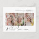 Signature script, 3 photo snapshot, graduation announcement postcard. Features, 3 vertical portrait photos on front and black typography.