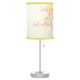 The lamp looks exactly like the picture, bright and colorful. The lamp shade is plastic not what I expected, however I love it! The printing is clear and the name can easily be read.