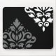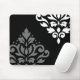 Scroll and leaf damask in a vintage style design, with gray and white detail on a black background.
