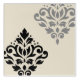 Scroll and leaf damask repeat design in black and grey detail on a cream color background.