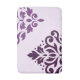 Scroll and leaf damask with two shades of purple detail on a light pink background in a modern style art print.