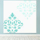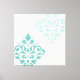 Scroll and leaf damask repeat design in light and mid-teal detail on a cream color background.