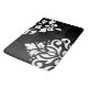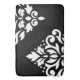 Scroll and leaf damask in a vintage style design, with white detail on a black background.