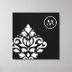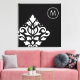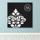 Scroll and leaf damask off-set (bottom left) design in white detail on a black background in a modern style art print with encircled initial top right to personalize.