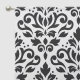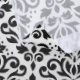 Scroll and leaf damask surface pattern design in black detail on a white background.