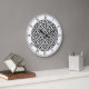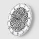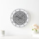Scroll and leaf damask in a vintage style pattern, with black detail on a white background with black on white Roman numeral clock surround.