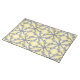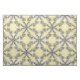 Placemat with an ornate pattern in light yellow, navy blue, and white. Detailed and intricate leafy scrollwork design.