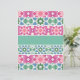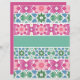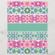 A series of colorful geometric patterns form a symmetrical design, reminiscent of traditional tile work. Each strip features a dominant color such as pink, blue, or green with watercolor textures, creating a visually harmonious composition.