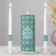 All the beauty of seaglass captured in a repeating pattern like a pebble mosaic. The ocean themed color palette includes aqua and seafoam greens. You can add initials to each taper and names or other text to the central area on the pillar.