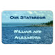 The blues and aquas of the sea and sky and the edge of a small island are the background for this magnet that you can customize with your name and cruise information for your family or group cruise. It's a view of the sea from a cruise ship. Use for a stateroom door marker and have a neat souvenir afterwards.