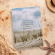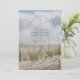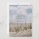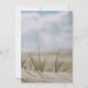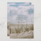 Wedding save the date cards with sea dunes design. Modern script for first names at the top with all wedding information hand-printed in the paragraph below. Text is very dark green-brown. The background image is sand and sea grass with blue sky and clouds. This beach themed design is meant for any coastal wedding event.