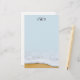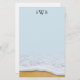 Monogrammed blank writing paper with beach sand and sea foam image at the bottom. Linen paper has a slight blue tint, or change the type of paper. Three black initials at the top can be removed. Edge of the ocean image at the bottom. No image on reverse.