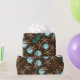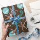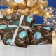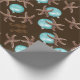 Tropical Christmas gift wrapping paper with starfish, sea horses and aqua blue ball ornaments design printed over dark chocolate brown color.