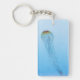 A watercolor painting of a jellyfish, with a colorful top, in the big, open, blue ocean.