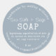 Elegant dusty blue soap sticker designed for handmade soap businesses. Featuring a clean round design with customizable ingredients list (saponified oils of olive oil, coconut oil, shea butter, sea salt, sage essential oil), weight, business name, and website. Perfect for coastal, spa-inspired, or natural skincare packaging.