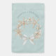 This garden flag has a watercolor image of a starfish sea shell wreath with the bride and groom's name and wedding date. Colors used include, slate blue, forest green, ivory and tan.