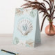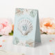 This Table number sign has a watercolor image of a white sea shell with the bride and groom's name and wedding date. Colors used include, slate blue, forest green, ivory and tan.
