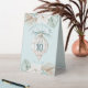 This Table number sign has a watercolor image of a white sea shell ornament with a blue bow. You can personalize with the bride and groom's name and wedding date. Colors used include, slate blue, forest green, ivory and tan.