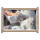 The artwork on this light wood Serving Tray is an original photograph by MaeFlowers of sea shells in sunlight and shadow. The beautiful conch shells are mostly white on the outside, with pale, pinkish brown lines spiraling softly down from the top of the sea shells. One shell curves inward revealing the light salmon pink interior, and we can see the pink color in some of the shadows. There is a beautiful blue color in others.