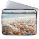 Let your mind drift as you think about the beach and collecting sea shells. Many sea shells in the sand along the shoreline. Crisp blue water and a row of tree's on other side of lake.