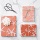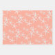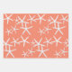 White starfish pattern wrapping paper sheets in set of three. White sea stars in various sizes are scattered over coral pink-orange paper in three shades. The beach themed design works for a tropical Christmas, graduation, birthday, housewarming and just about any occasion.