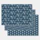 Dark navy blue wrapping paper sheets with sea life designs. Starfish, or sea stars, sand dollars and dolphins are featured on each of three sheets. The background color is dark blue color. The patterns work for a tropical Christmas, graduation, birthday, housewarming and just about any occasion. The darker color is perfect for wrapping gifts for men who love the ocean. This paper comes rolled, so no fold lines!