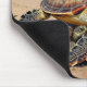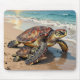A coastal themed mouse pad with an illustration of a mama sea turtle and baby crawling into the blue ocean waves on a sandy beach.