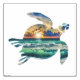 A digital art design of a beach at sunset with turquoise waves framed in the silhouette of a sea turtle.