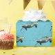 Sea turtles in splashing blue water on aqua background.