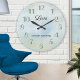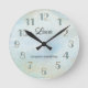 Wall clock featuring an artistic painted seafoam colored design with (optional) gold and pale teal numbers.