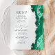 The right-hand edge of this elegant modern wedding menu features a seafoam green watercolor agate border trimmed with faux silver glitter. The customizable text combines charcoal gray Roman serif and copperplate fonts on a white background. The reverse side features a matching seafoam and silver agate design.