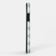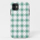 This phone case has a mid-century modern design of solid seafoam diamonds inside seafoam diamond outlines on a field of white.