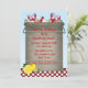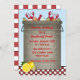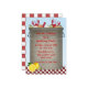 A fun invitation for a crab boil or seafood party. Party text is placed on big pot of crabs, corn, onions and potatoes. Pot sits on red checkered border with lemons. Checkered pattern on back of card too.