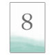 Beachy chic table number cards in soft shades of seaglass green and white feature a watercolor wash at the bottom that evokes the ebb and flow of the tide, with your table number in medium gray. Design repeats on reverse side. Coordinates with our Seaglass Tides wedding invitation suite.