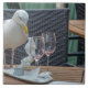 An unusual photograph of a seagull next to two empty wine glasses printed on a ceramic tile.