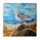 a traditional watercolor artwork featuring a little seagull sitting on a rock in front of a sandy beach and a blue ocean under a cloudy sky.