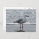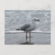 This seagull is walking along a sandy beach with wet feet and the water lapping the shore very close to him.