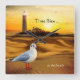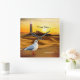 Wall clock featuring a sunset on the dunes and beach with a cute seagull and your custom texts. The hour indication is optional and can be deleted if you do not need it.