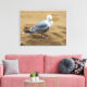A close up photograph of a seagull on a sandy beach printed on a canvas print.