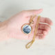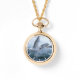 Seagulls flying over the sea, in tones of blue, white and gray with touches of complementary gold.