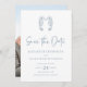 This classic minimal white and dusty blue wedding save the date card is perfect for coastal and nautical themed and beach destination weddings, with 2 cute seahorses kissing at the top, trendy handwriting script, and a photo template on the back.