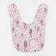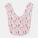 Baby bib with an ocean theme. Shades of pink seahorses, coral, and scallop shells on a pale green background. Reverse side of bib has smaller print of the same pattern.