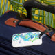 This custom luggage tag is shown in white with a blue seahorse print design.
