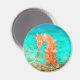 Beautiful translucent orange seahorse against turquoise ocean water. Colors of blue, turquoise and orange.