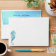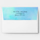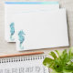 Stylish seashore themed wedding invitation envelope, with an aqua and blue watercolor lining and covering the back flap. A decorative seahorse is on the left front of the envelope. Personalize the return address for your beach wedding.