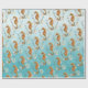 A nautical wrapping paper featuring watercolor painted seahorses with coral and seaweed against a Caribbean turquoise blue ombre background.