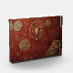 An ornate emblem glows in gold against a textured crimson backdrop, surrounded by arcane symbols and cryptic inscriptions.