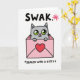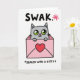 This greeting card shows a gray cat peeking out from a soft pink envelope, with big green eyes and a sweet, curious look. The cat’s little paws rest on the top edge of the envelope, as if it’s popping up to say hello. A bright red heart sits on the front of the envelope, making the love theme clear right away ❤️. The background is plain white with simple black outlines, so the cat and envelope stand out easily. At the top, the text “SWAK” appears in large, dark block letters, with a small pink asterisk right next to it. Along the bottom, the message “*SEALED WITH A KITTY*” is written in matching dark letters, like a fun note that explains the initials 💌. It feels like a cute little secret Valentine being delivered, perfect for romance or friendship 🍫.